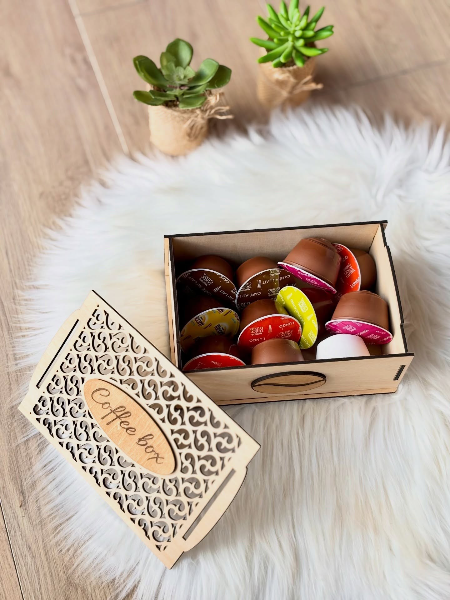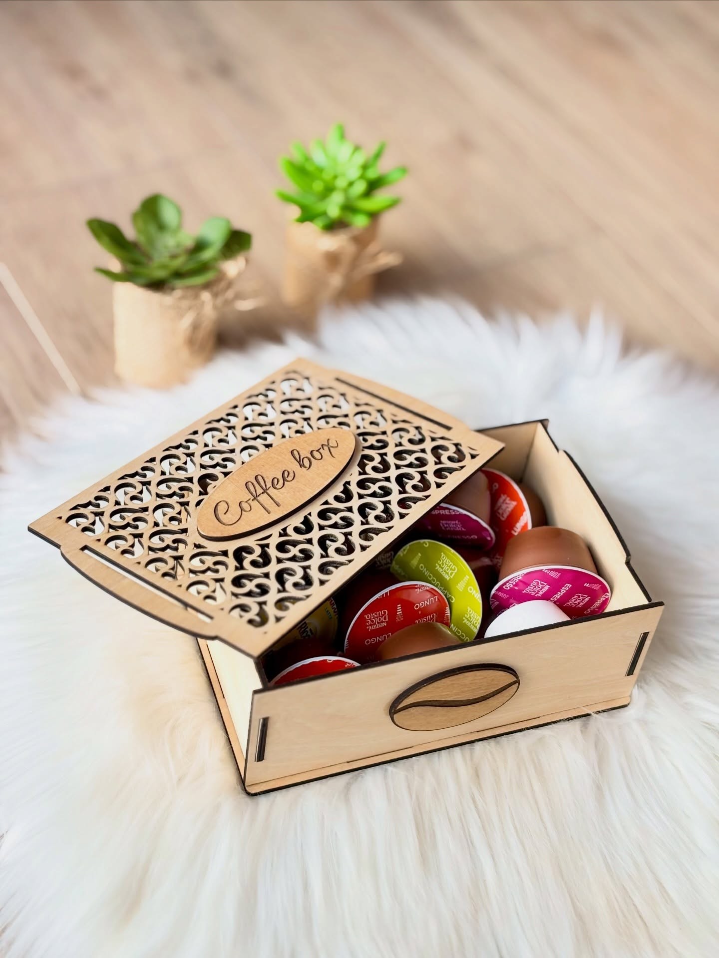 Boite à capsules café en bois tilleul gravé et découpé au laser