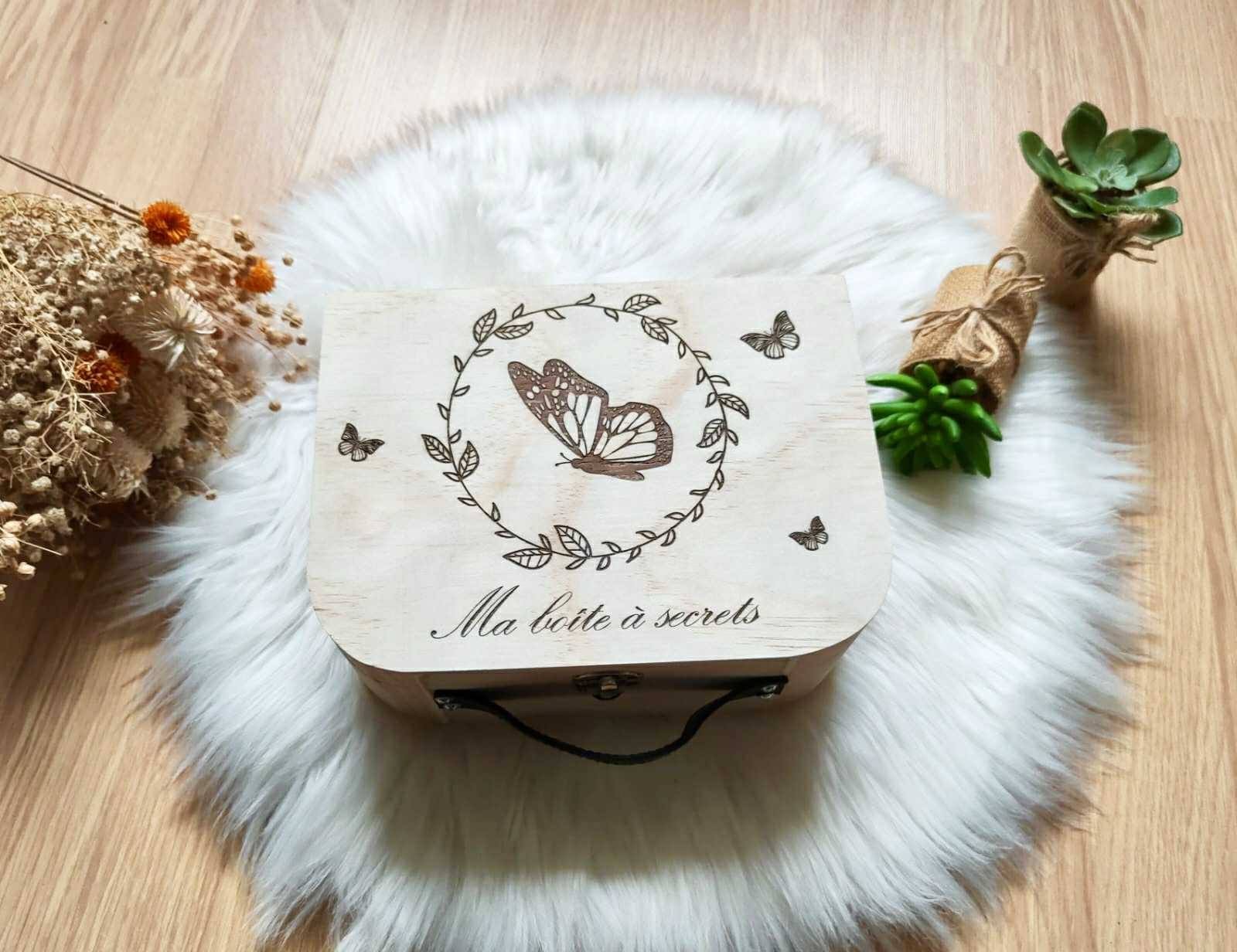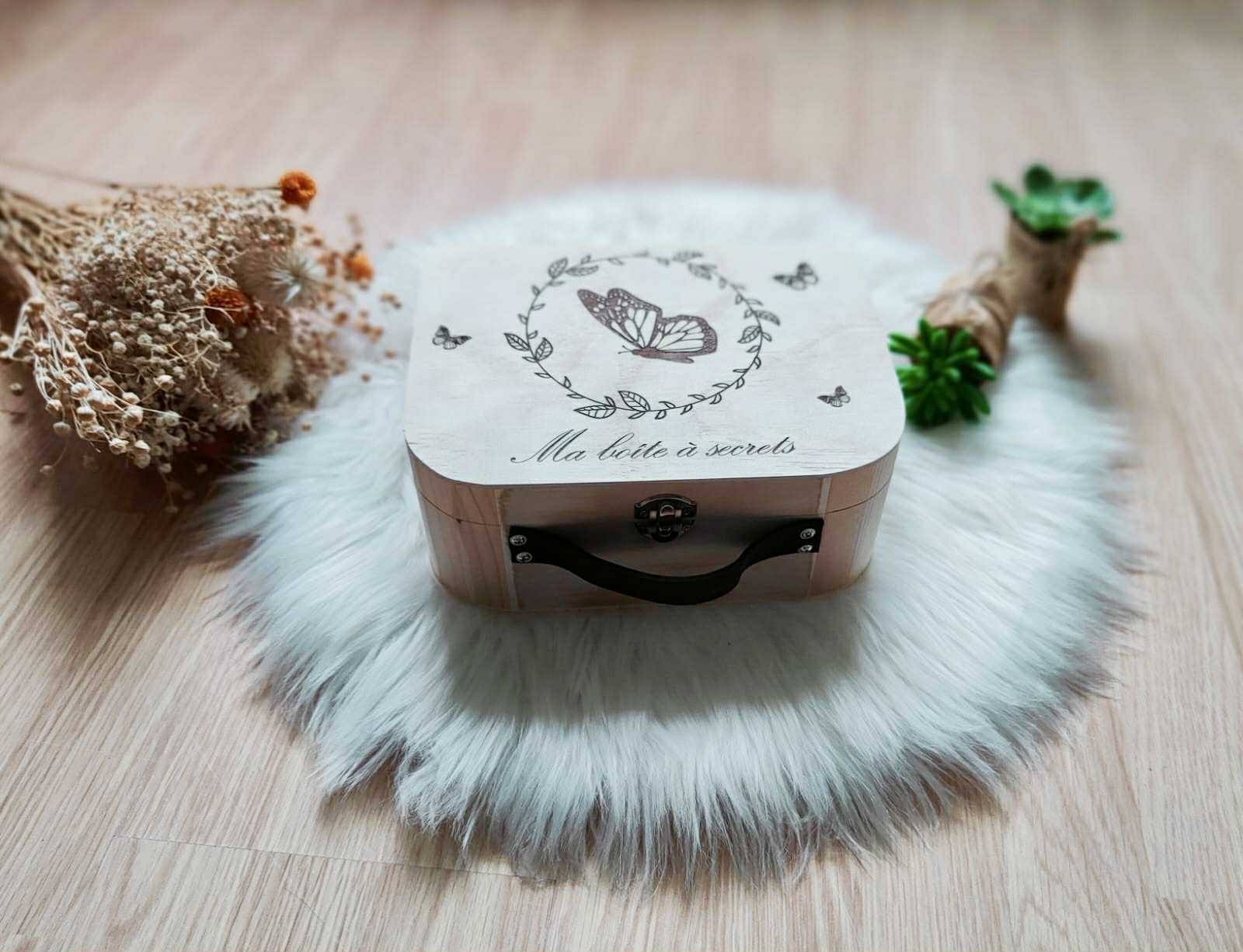Cette valise en bois personnalisée, gravée avec soin au laser, reflète toute l’attention portée aux détails. Plus qu’un simple objet, c’est un véritable écrin pour ranger ses petits trésors et accompagner ses souvenirs d’enfance
